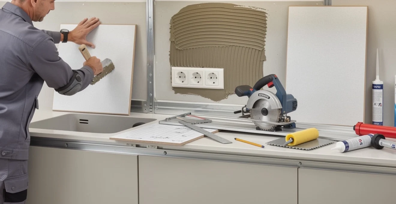 Dans tous les cas, il est impératif de dépoussiérer soigneusement le support avant application d’un primaire ou d’une colle. Les anciennes peintures satinées ou brillantes doivent être légèrement poncées au grain 80 à 120 afin de créer une micro-rugosité favorable à l’accrochage. Si l’ancienne crédence était en carrelage, deux options s’offrent à vous : soit déposer les carreaux pour repartir sur un mur nu, soit dégraisser et poncer la faïence avant de poser les panneaux HPL par collage avec une colle adaptée aux supports non poreux. Cette seconde solution, très appréciée en rénovation rapide, évite les travaux lourds et les gravats tout en offrant une excellente tenue dans le temps si la préparation est soignée.